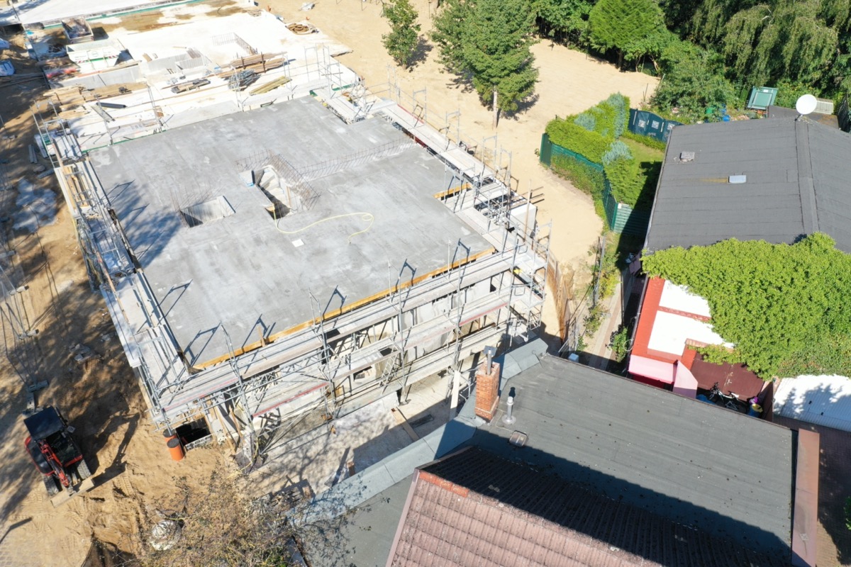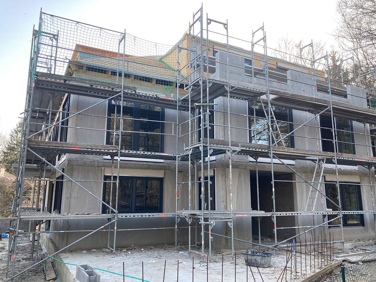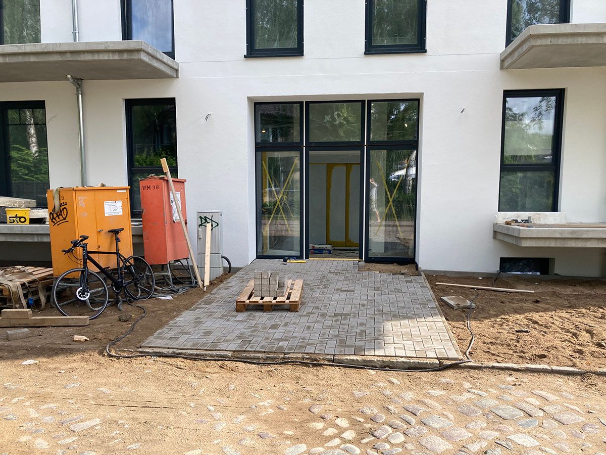 Hier in der Gartenstadt entstehen seit Dezember 2020 drei auf einer Tiefgarage stehende Häuser mit fünfzehn Wohnungen. Rostocks Stadtteil mit Chlorophyll-Garantie - modern erwohnbar.